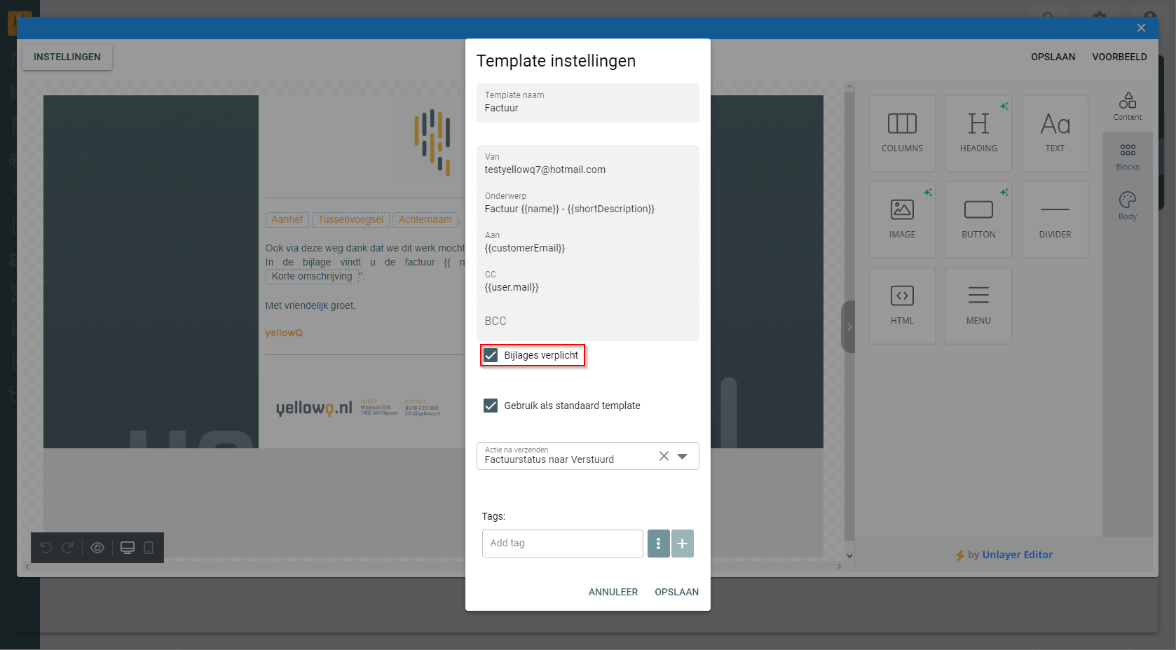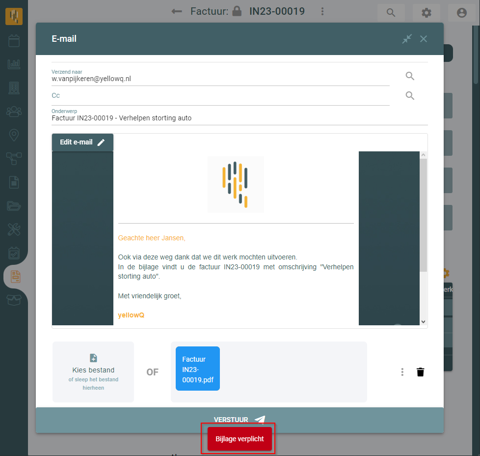 Binnen yellowQ is het makkelijk om een email te versturen met bijlages erin. Je kan binnen de email template nu aanvinken of een bijlage verplicht moet worden meegestuurd. Hiermee voorkom je dat een mail wordt verstuurd zonder bijlage. In deze handleiding zie je hoe je dit kan toepassen binnen yellowQ.