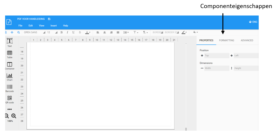 Zorg dat het beeldscherm niet is ingezoomd. Bij instellingen wordt getoond of het beeld is ingezoomd (het gaat hier niet over het percentage van zoom in de pdf-generator). Het is van belang dat deze op 100% staat. Wanneer dit niet het geval is functioneert het programma niet optimaal bij het verplaatsen van componenten.